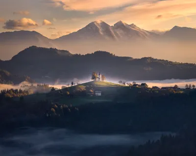 Cerkev svetega Tomaža nad Škofjo Loko ponuja povsem drugačno izkušnjo. V zgodnjih jutranjih urah, ko megla iz bližnjih rek ovije doline, se zdi, da cerkvica lebdi nad oblaki. Ko prvi sončni žarki osvetlijo alpsko ozadje, postane jasno, zakaj to velja za eno najbolj fotogeničnih lokacij v državi.