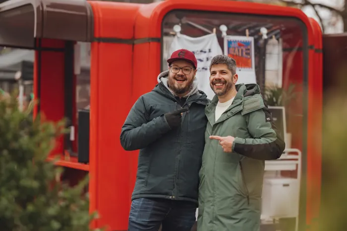 Standup komik Sašo Stare in avtor projekta Matija Jašarov.