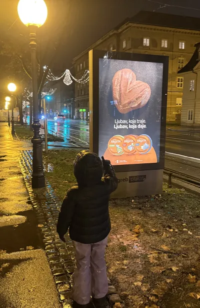 Mislim, da oglas ni slab, da je po privlačnosti vsaj v zgornji četrtini oglasov, ki jih je bilo v zadnjih letih moč videti na naših ulicah. Se pa strinjam tudi s tem, da bi ga ti (bralec ali bralka, ki si kreativec ali kreativka) znal narediti veliko, veliko boljše. Imam prav? Brez heca, čisto iskreno mislim, da oglas res ni slab. Toda to ni vprašanje, ki sem ga postavil. Vprašanje se glasi, ali je oglas dober? To je najboljši oglas, ki sem ga jaz naredil v letu 2025 … Tudi to ni odgovor na zastavljeno vprašanje. Sprašujem se, ali sem bil ponosen zato, ker je oglas dober, ali zato, ker je kruh v obliki srca očaral mojo 5-letno deklico, jaz pa sem k temu vizualu dodal nekaj izjemno lepih besed? Why not both, bi rekel popularni meme.